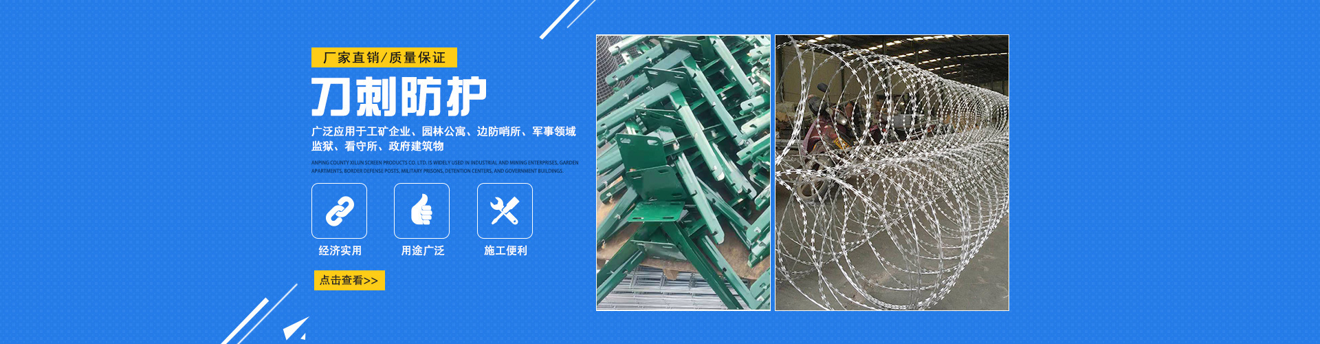 安平初日絲網有限公司主要產品有刀片刺繩、刺絲滾籠、刺繩支架、護欄網、隔離網、球場圍網等多種產品,公司擁有先進的生產設備和技術,以“質量求生存,信譽謀發展”為生產原則,為新老用戶提供高質量產品。